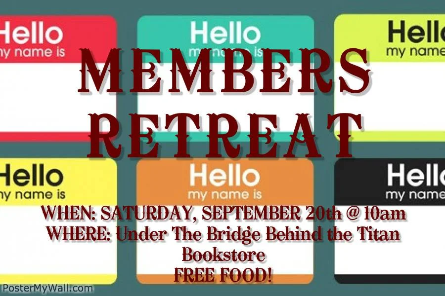 Want to meet new friends? Do fun activities? And eat FREE FOOD?! Come to Members' Retreat September 20th @ 10am at UTB (Under The Bridge) behind the Titan Bookstore! Bring your friends and a huge smile!