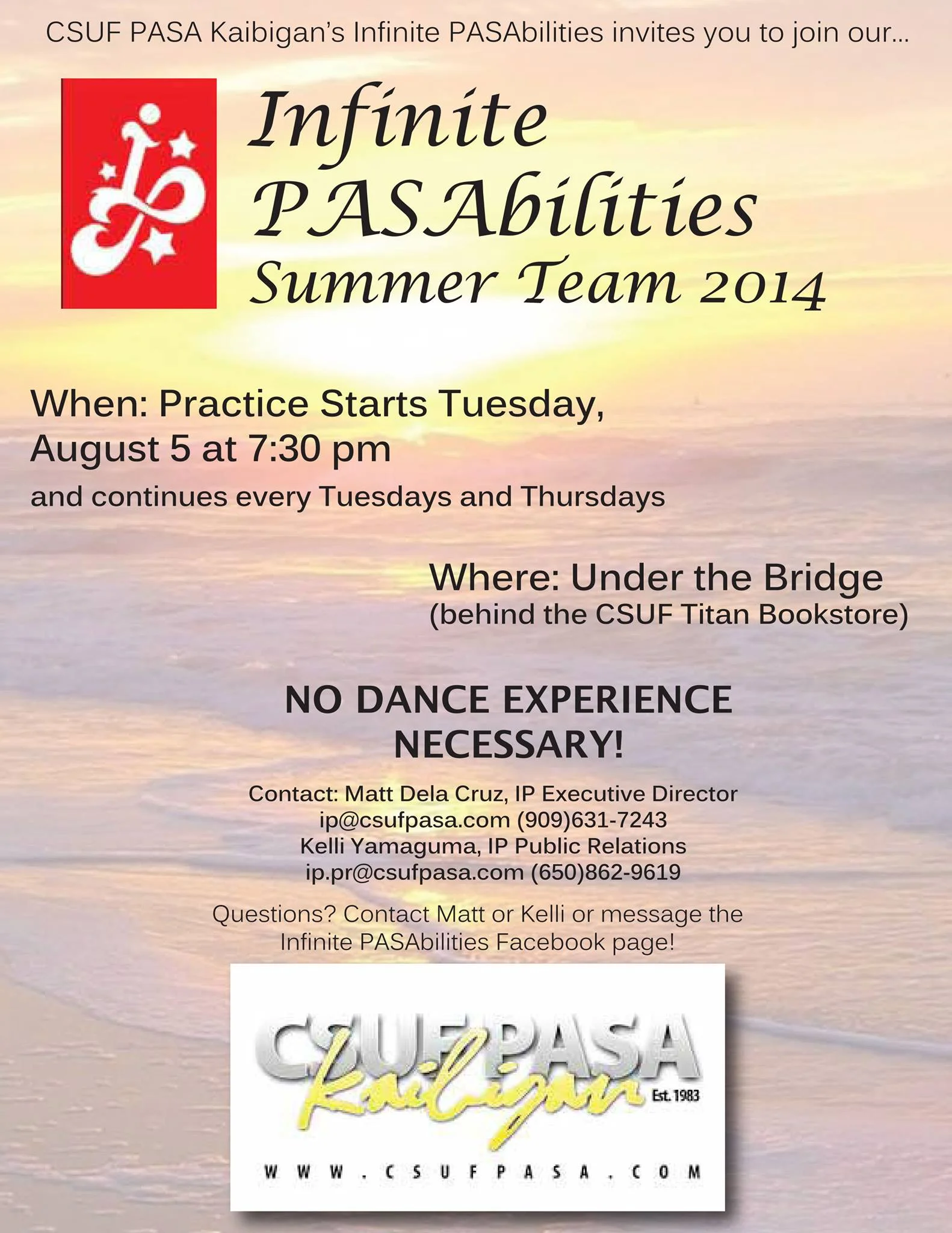 Support Infinite PASAbilities Summer Team & join their first practice Tuesday, August 5, at 7:30 PM. The practice will be held Under the Bridge (UTB) behind the CSUF Titan Bookstore. There is NO dance experience necessary & NO audition process! Come out and have a good time with some great people.