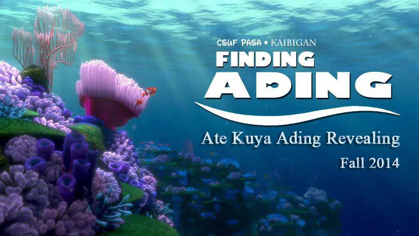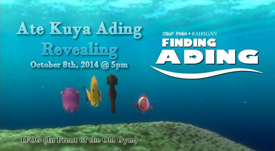 WHO: All you future Ates, Kuyas, and Adings! WHEN: Wednesday October 8th @ 5pm WHERE: IFOG (In Front of Old Gym) THEME: Finding Ading (Under the sea, seashells, turtles, flower leis, floaties, water, etc.)